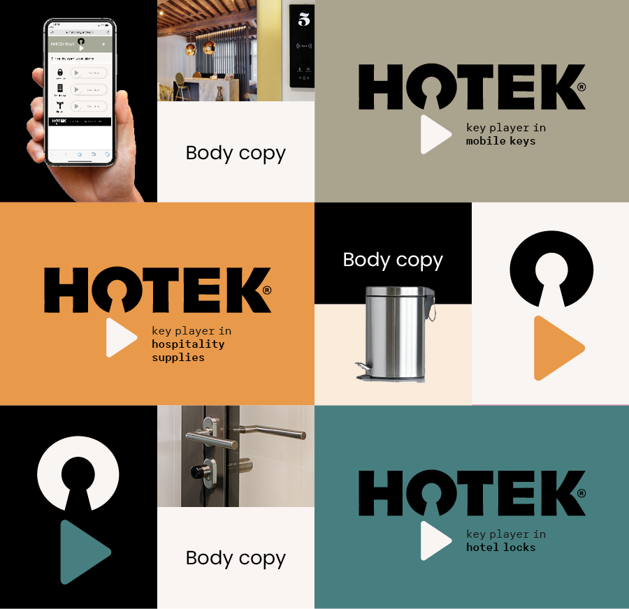 We hebben synergie gecreëerd door de creatie van een sterke pay-off die wordt gebruikt voor het moedermerk, maar ook voor de sublabels. De nieuwe pay-off en ook het campagne thema is ‘key player in hospitality’. Met deze pay-off refereren we met een knipoog aan het verleden en zeggen we op een sympathieke manier dat Hotek de belangrijkste speler in de markt is. Een speler waar je niet omheen kan als je zelf een serieuze speler bent in de horeca en hotelmarkt. We kiezen voor het woord hospitality omdat dit het mogelijk maakt om ook in de toekomst meer horeca producten toe te voegen die niets met toegang te maken hebben. De nieuwe positionering laten we terug komen in het gemeenschappelijke beeldmerk. Het nieuwe logo bestaat uit een sterk woordmerk dat is gebaseerd op moderne maar ook tijdloze typografie die vertrouwen uitstraalt en een gemeenschappelijk beeldmerk waarin we ‘key player’ visualiseren. Zodat het herkenbaar en eigen is en zodat we het beeldmerk ook los kunnen toepassen op de producten die Hotek levert.