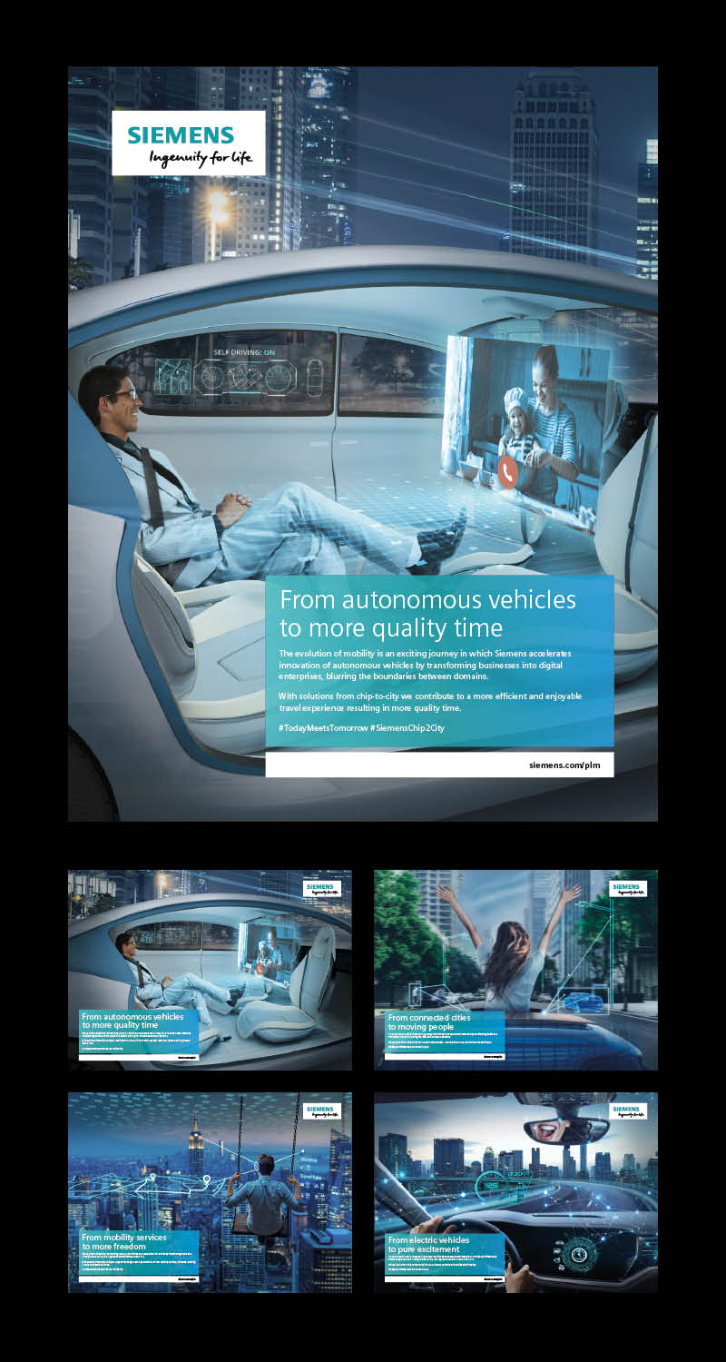 Net als Google en Tesla is Siemens volop bezig met mobiliteit en zelfrijdende auto’s. Het Duitse bedrijf daagde ons uit om hun toekomstvisie ‘From Chip to City’ vorm te geven en onder woorden te brengen. Moving people. Not only from A to B, but also from head to heart. Dat laatste is een zeer belangrijke boodschap in deze campagne. De campagne wordt zowel intern als extern gebruikt. Wereldwijd. Op dit moment wordt hij vanuit Siemens uitgerold in diverse landen. Het laat dus niet alleen zien dat Siemens al lichtjaren verder is met de ontwikkeling van hoogwaardige technologisch oplossingen, maar in het geval van SuperRebel ook dat een klein bureau prima concepten voor grote internationale campagnes kan maken. Wat dat betreft zijn wij Nederlanders nog steeds echte wereldveroveraars. Meer weten? Maak dan een afspraak met Bonnie van Doorn (bonnie@superrebel.com).