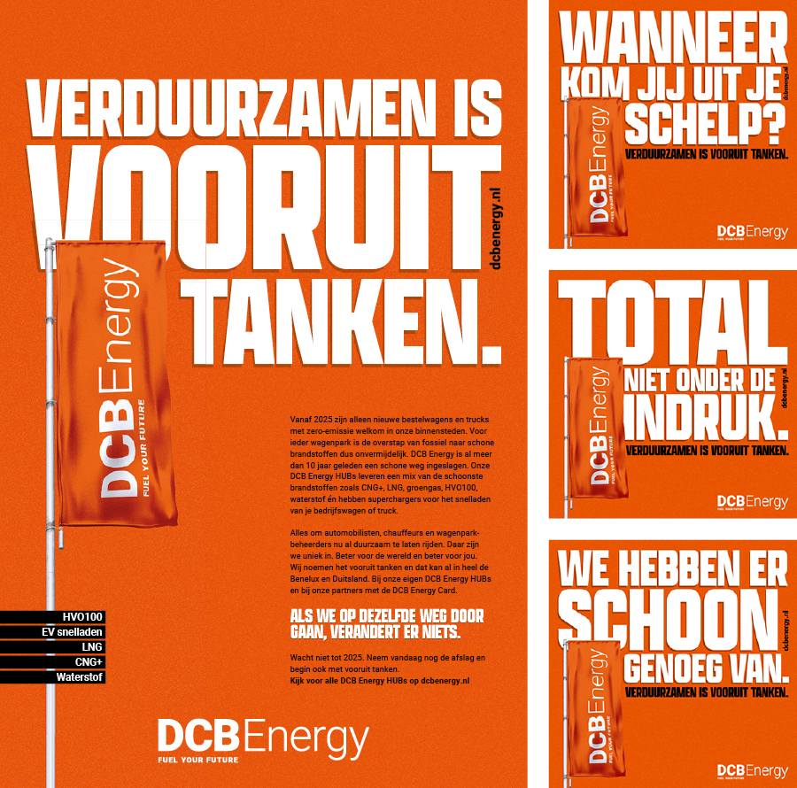 DCB Energy is geen doorsnee tankstation en durft een andere route te kiezen. Ze hebben ook helemaal niks met de term verduurzamen. In hun ogen moet je niet alleen duurzaam denken, je moet het vooral ook tanken. En daarmee is de nu al iconische oranje Denktank geboren en het uitgangspunt van de campagne: verduurzamen is vooruit tanken. Waarom wachten als je vandaag al de afslag kunt nemen en kunt beginnen met vooruit tanken.