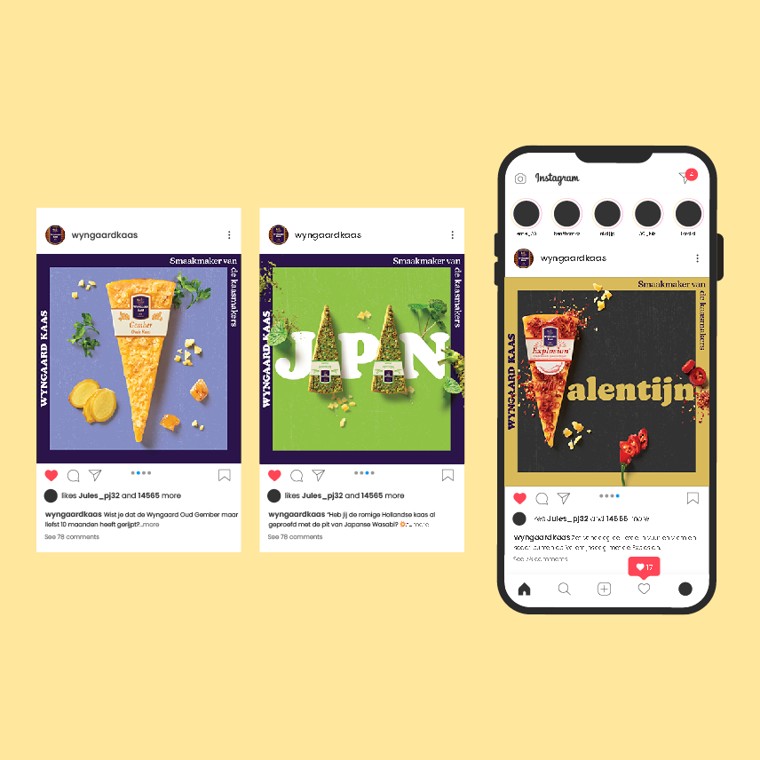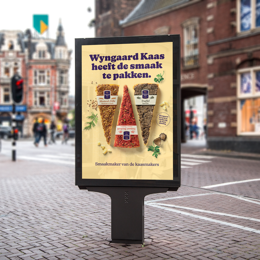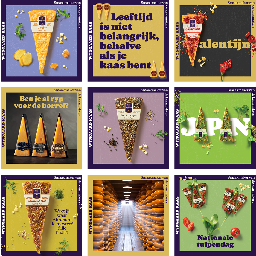 Op basis van de nieuwe positionering hebben we de huisstijl aangepast, campagne uitingen ontwikkeld en verschillende verpakkingen en cadeauverpakkingen opnieuw ontworpen. Daarnaast hebben we de social media content opgezet en uitgerold. Eigenlijk op alle zichtbare punten is Wyngaard nu de smaakmaker onder de kaasmakers. Het uiteindelijke doel is om alle kaasplankjes in Nederland te voorzien van meer smaak.