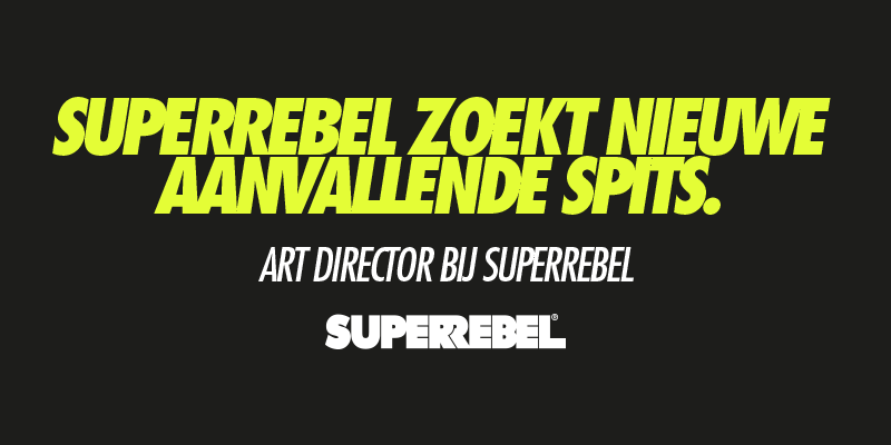 Wij zijn op zoek naar een ervaren en kritische Art Director die eindverantwoordelijk is voor de art direction binnen SuperRebel Agency. Conceptueel denken zit in je genen. Je werkt regelmatig samen met onze Copywriters, Creatieve Director en Designers. Je weet als geen ander merk en doelgroep aan elkaar te koppelen. Daarom is voor jou een belangrijke rol binnen SuperRebel Agency weggelegd bij het bedenken van concepten, campagnes en ideeën waarmee we indruk maken in pitches.