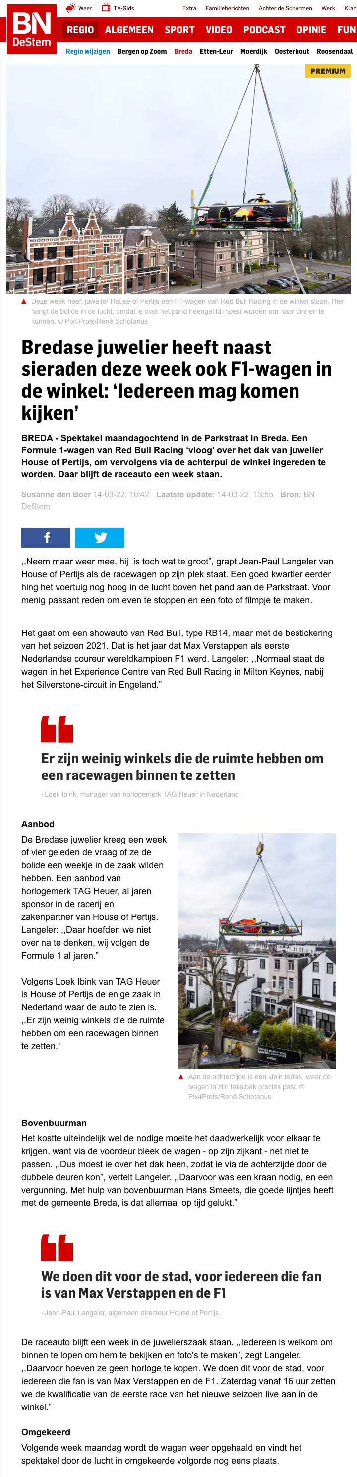 Free publicity is de goedkoopste vorm van reclame. En vaak ook de meest waardevolle. Maar ook dat begint altijd met een goed 'guerilla' idee. Hoe vaak zie je in Breda een F1 auto over een gebouw getild worden? Wat een prachtige pr voor House of Pertijs en TAG Heuer in onder andere BN DeStem en Talpa's Hart van Nederland. Wat ons betreft was deze campagne al geslaagd voor hij begonnen is. Daar doen we het voor bij SuperRebel® Agency. Toeval bestaat echt niet. SuperRebel heeft de campagne en pr-strategie ontwikkeld voor deze actie i.s.m. Meltem Pertijs. Hieronder het artikel uit BN De Stem.