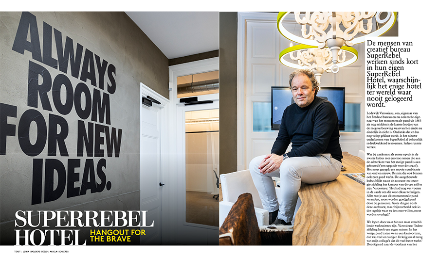 Het begon als een grap en met dank aan een aantal investeerders die ons een warm hart toedragen hebben we SuperRebel Hotel - Hangout for the Brave kunnen realiseren. Ons nieuwe clubhuis, waar je niet alleen SuperRebel Agency en SuperRebel Kidsgear vindt, maar ook Organto Foods en een 10-tal ondernemers die lid zijn van Club SuperRebel en van hieruit hun bedrijf opstarten of hun netwerk onderhouden. De eerste leden zijn gearriveerd. Het is een plaats die inspireert, waar mensen energie krijgen en waar ze andere mensen kunnen ontmoeten. Het eerste hotel waar je niet kan slapen.