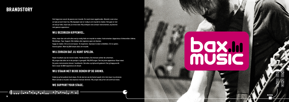 SUPERREBEL heeft de afgelopen maanden samen met het team van BAX MUSIC in Goes keihard gewerkt aan de ontwikkeling van de brand story, het “nieuwe” merk Bax Music en het nieuwe logo. Deze hele huisstijlfacelift is nu vastgelegd in het brand book. Bovendien is er binnen het team een nieuwe pay-off bedacht die voortaan in alle uitingen zal terugkomen: WE SUPPORT YOUR STAGE.