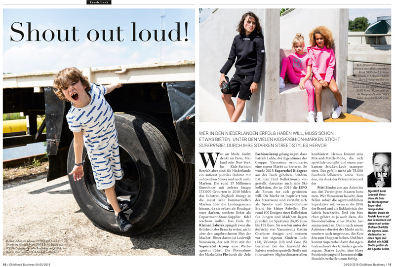 Das Ende der Kleinen Fabriek spiegelt zwar die Brüche in der Branche wider, nicht aber den ungebrochenen Mut der Macher. Einer davon ist Lodewijk Varossieau, der seit 2011 mit der Superrebel Group eine Werbeagentur führt. Die Übernahme der Marke Like Flo durch die Jolo Fashion Group gelang so gut, dass Patrick Lohle, der Eigentümer der Gruppe, Varossieau ermunterte, eine eigene Marke zu kreieren. So wurde 2015 Superrebel Kidsgear aus der Taufe gehoben.