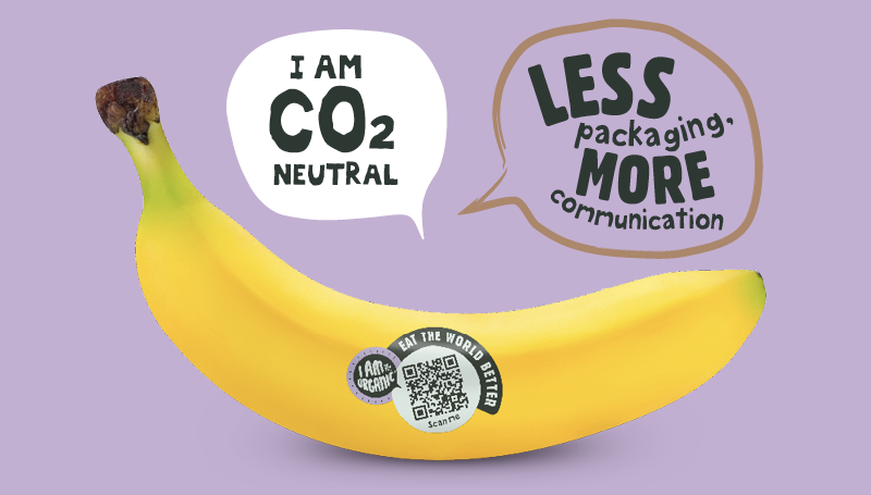 Zo heeft de banaan van I AM Organic als enige verpakking slechts een sticker met een QR-code, die na scannen het digitale paspoort prijsgeeft en het eerlijke verhaal van de banaan vertelt. In het digitale paspoort valt te lezen en te zien dat deze zogenaamde Cavendish banaan is opgegroeid bij boerin Jetta van Berg in de Dominicaanse Republiek. Vanuit de haven Santa Domingo of Manzanillo vaart de banaan gekoeld naar Rotterdam of Vlissingen om daar door te rijpen tot perfectie. Dankzij de samenwerking met FairClimateFund is de productie en de reis volledig CO2 neutraal.