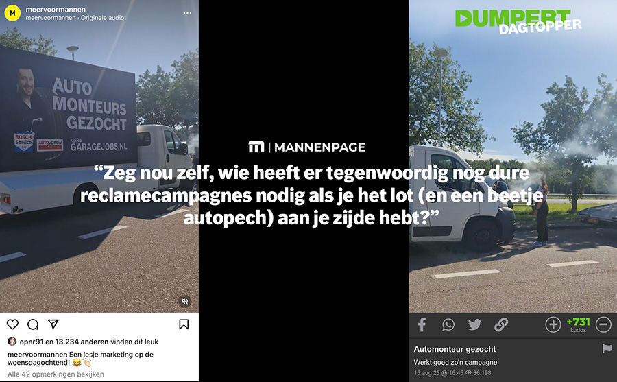 In essentie ontwikkelde SuperRebel Agency een traditionele outdoor campagne, een moving billboard die op één van de drukste vakantiedagen over de snelweg reed. Voor het budget het maximaal haalbare. Tot het moving billboard pech kreeg en een automonteur nodig had. Met minimale middelen, waaronder een rookmachine, werd langs de snelweg pech gefingeerd en kreeg de boodschap ‘Automonteurs gezocht’ een nieuwe, humoristische lading. Immers, als de truck zelf al pech krijgt, dan is de nood hoog.